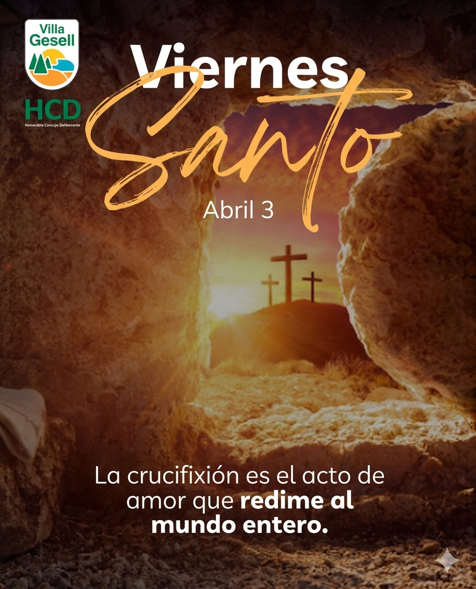 «En este Viernes Santo, el Honorable Concejo Deliberante de Villa Gesell invita a la comunidad a un tiempo de reflexión y recogimiento. Es un día para renovar la fe, cultivar la paz y fortalecer los lazos de solidaridad que nos unen como vecinos. Que esta jornada de serenidad nos inspire a trabajar unidos por el bien común y la esperanza en nuestro futuro.»